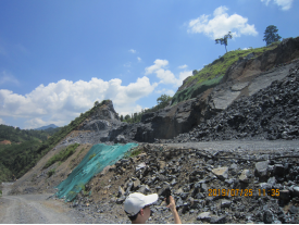 礦山按照設計采用露天分臺階式自上而下開采,公路開拓,中深孔爆破,挖掘機裝車,汽車運輸。目前,東山頭采場已按照設計完成剝離工作,布置有+535m~+520m(北側)及+520m~+505m(南側)采礦臺階,即北側形成了+535m鑿巖平臺、+520m裝礦平臺,南側形成了+520m鑿巖平臺、+505m裝礦平臺;臺階高度13~15m,臺階坡面角60°~70°,裝礦作業平臺寬度約50m。西山頭采場上部已形成多個終了臺階,終了邊坡部分已綠化,臺階高度約15m,終了坡面角約65°,平臺寬度5~6m。符合設計對終了臺階要求。礦山西山頭下部布置有+430m~+415m及+415m~+400m采礦臺階,即+430m鑿巖平臺、+415m鑿巖平臺和+400m裝車平臺;臺階高度13~15m,臺階坡面角60°~70°,作業平臺寬度約50~60m。
