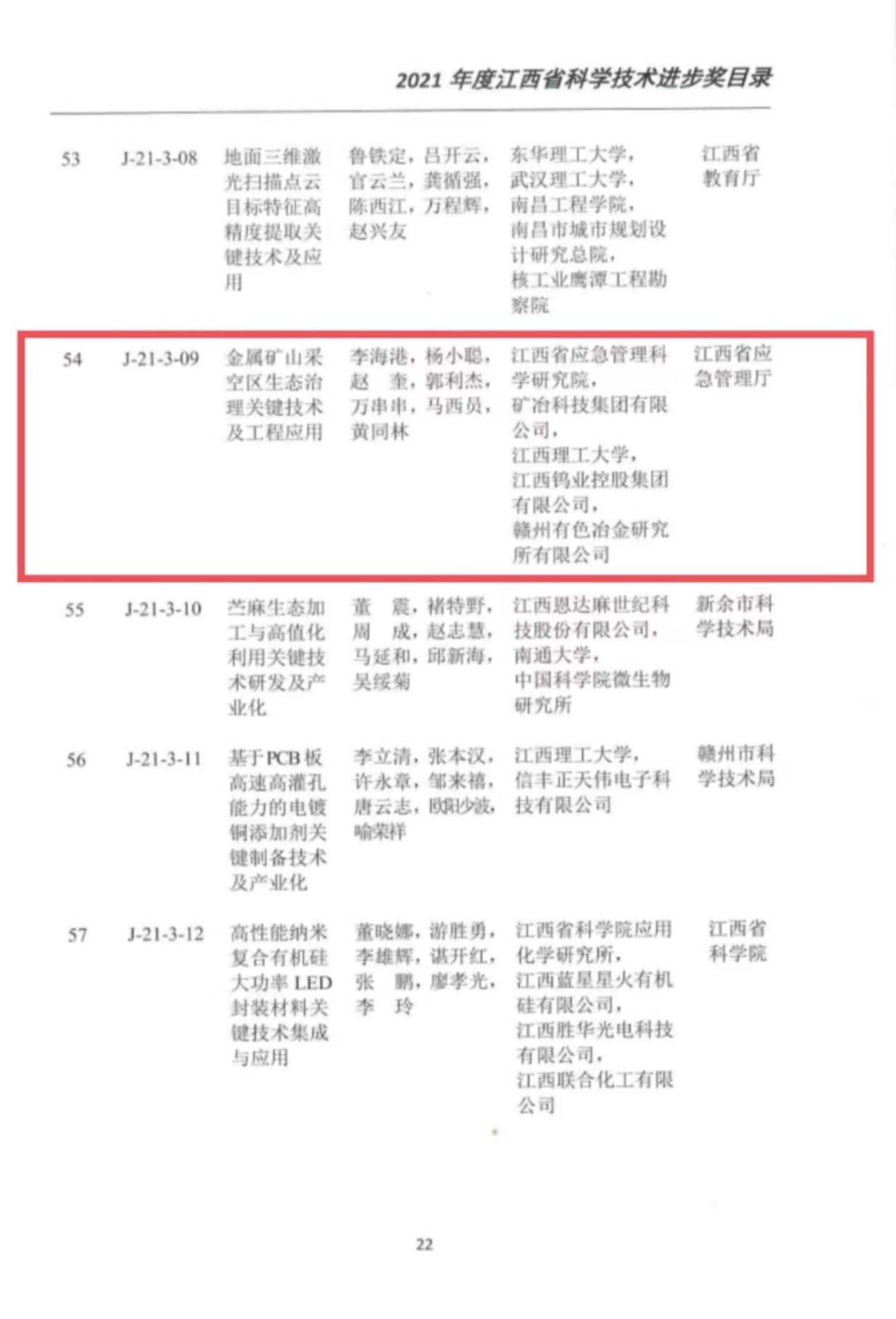 發(fā)布日期:2022-08-18 22:42 信息來(lái)源:科信處 字號(hào):[大] [中] [小]8月18日,省委、省政府召開(kāi)全省科技創(chuàng)新大會(huì),會(huì)議表彰了2021年度江西省科學(xué)技術(shù)獎(jiǎng)獲獎(jiǎng)成果,省應(yīng)急管理科學(xué)研究院聯(lián)合礦冶科技集團(tuán)有限公司、江西理工大學(xué)、江西鎢業(yè)控股集團(tuán)有限公司共同申報(bào)的“金屬礦山采空區(qū)生態(tài)治理關(guān)鍵技術(shù)及工程應(yīng)用”成果榮獲江西省科技進(jìn)步三等獎(jiǎng),首次以第一承擔(dān)單位榮獲省科技進(jìn)步獎(jiǎng),標(biāo)志著省應(yīng)急廳與國(guó)家級(jí)大院大所的科創(chuàng)平臺(tái)合作運(yùn)行取得了顯著成效。